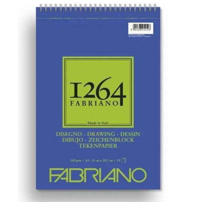 Χαρτί Σχεδίου Fabriano 180 gr Α4 50 Φύλλων Σημειωματάριο Σπειροειδούς Σχεδίου F19100647 "ΣΧΕΔΙΟ" άλμπουμ όλων των τεχνικών σχεδίασης από τη σειρά "1264" της ιταλικής μάρκας Fabriano (το όνομα "1264" συνδέεται με τη χρονιά που ιδρύθηκε η παραγωγή). Το άλμπουμ περιέχει χαρτί υψηλής ποιότητας με πυκνότητα 180 g/m2, λευκή, μεσαίου κόκκου υφή επιφάνειας, που θα σας επιτρέψει να κάνετε λεπτομερείς εργασίες. Τα άλμπουμ είναι κατάλληλα για μολύβια, στυλό, απαλά και λαδοπαστέλ και άλλα ξηρά υλικά.